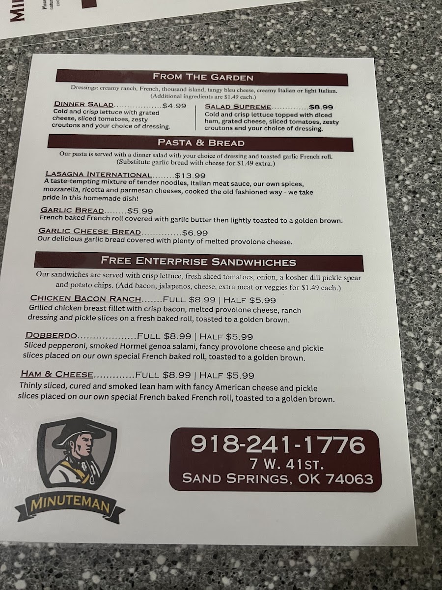 Welcome to Minuteman Pizza Parlor, a beloved local gem located in Sand Springs, OK. This third-generation pizzeria is renowned for its homemade sauces and breads, providing a warm and welcoming atmosphere that'll make you feel right at home.